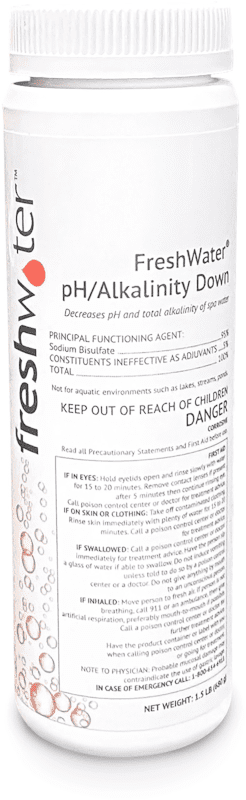FreshWater pH Down/Alkalinity Down is a granular formula that decreases pH and total alkalinity of your hot tub water. Sanitizer effectiveness is increased when pH levels are in the proper range.